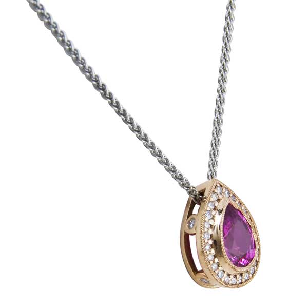 Gemstones, Pear shape color stone with Halo set of diamonds.