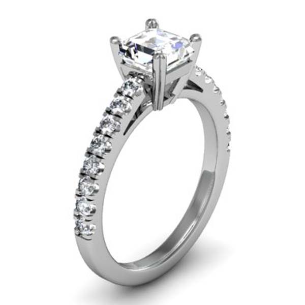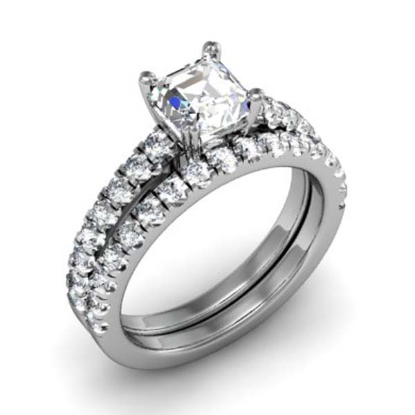 Engagement Ring, ring with matching band having round diamonds in a shared prong setting.