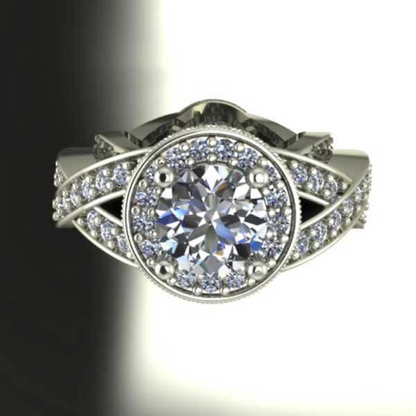 Engagement Ring, Halo spherical ring with micro pave round diamonds having criss cross sides